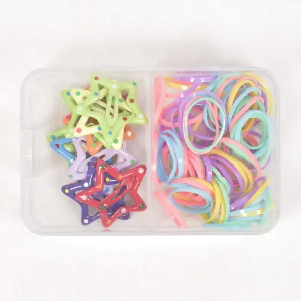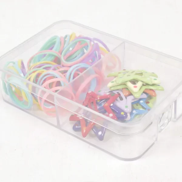 Cajita plástica con más de 200 banditas elásticas y 10 hebillas en forma de estrella.
