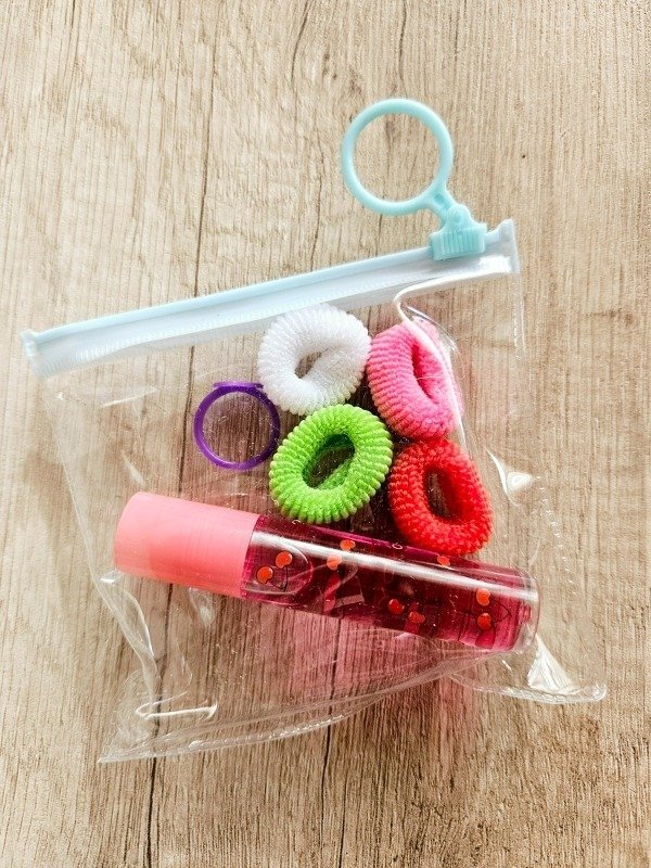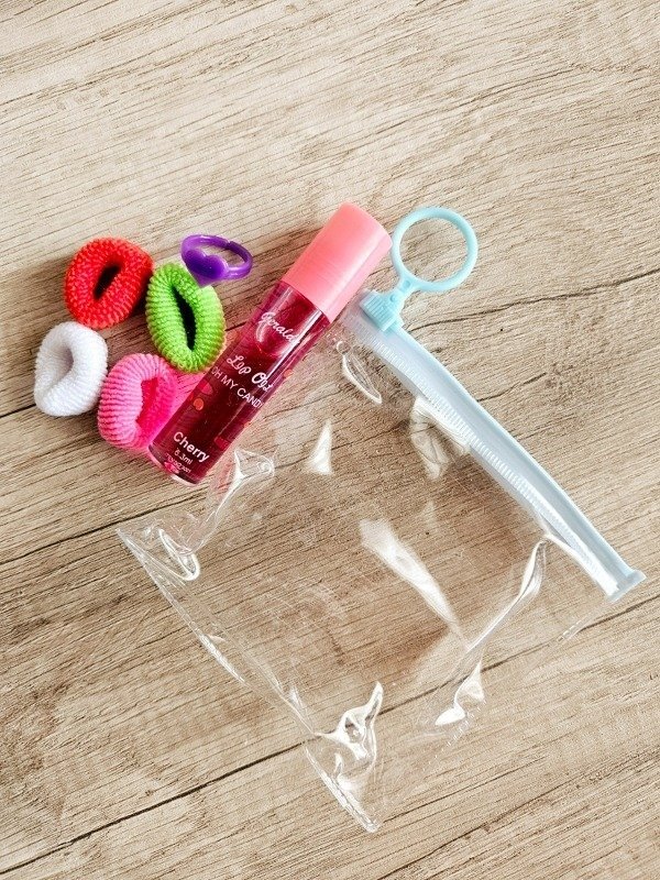 Incluye lip gloss con aroma a frutas, 4 coleritos y 1 anillito plástico, en sobre plástico con cierre ziploc.