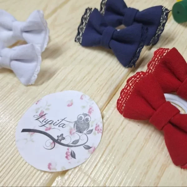 Par de coleritos pequeños con moño de tela y detalles de puntilla.