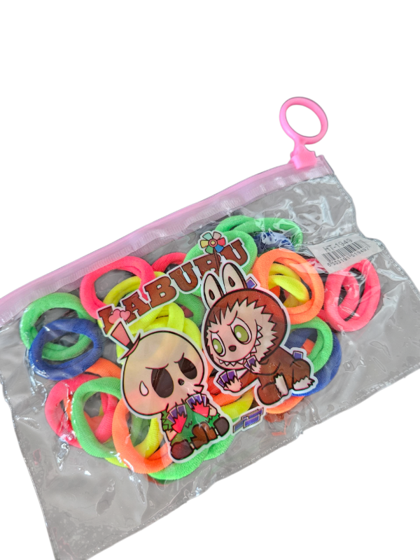 Sobre plástico con cierre ziploc con 30 coleritos elastizados de colores fluo.