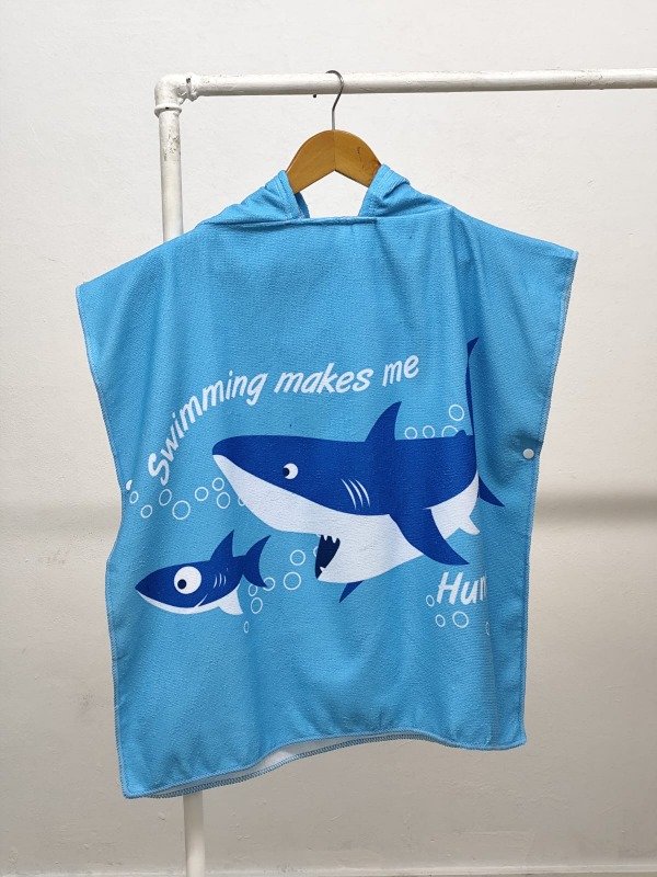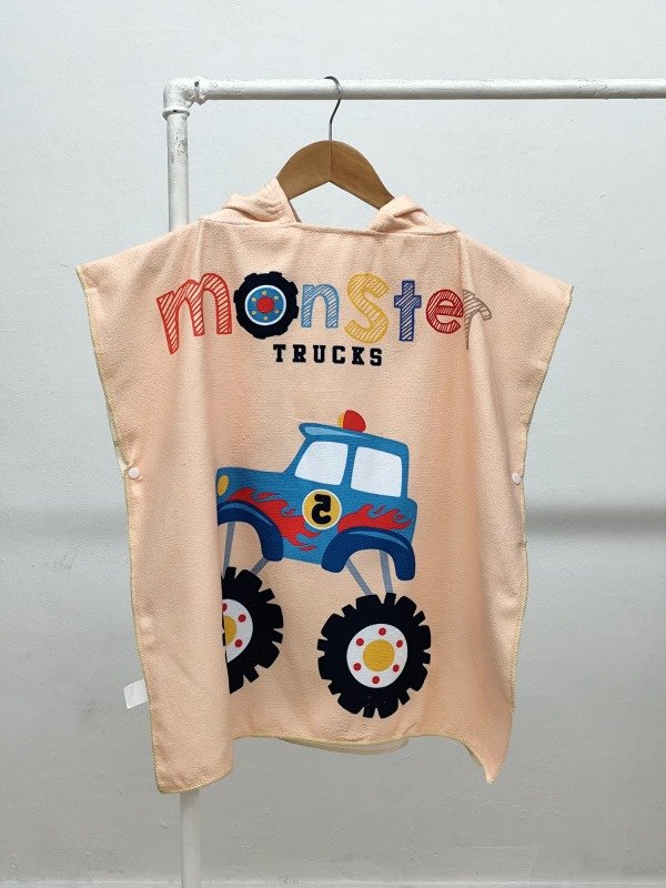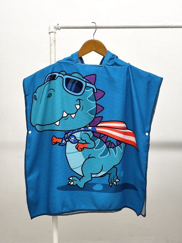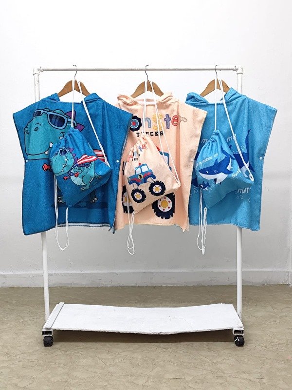 Ponchito de toalla con capucha y brochecitos plásticos a los costados. 100% microfibra de secado rápido. Edad aproximada: 2 a 7 años. Incluye mochilita de 28x32 CM aprox.