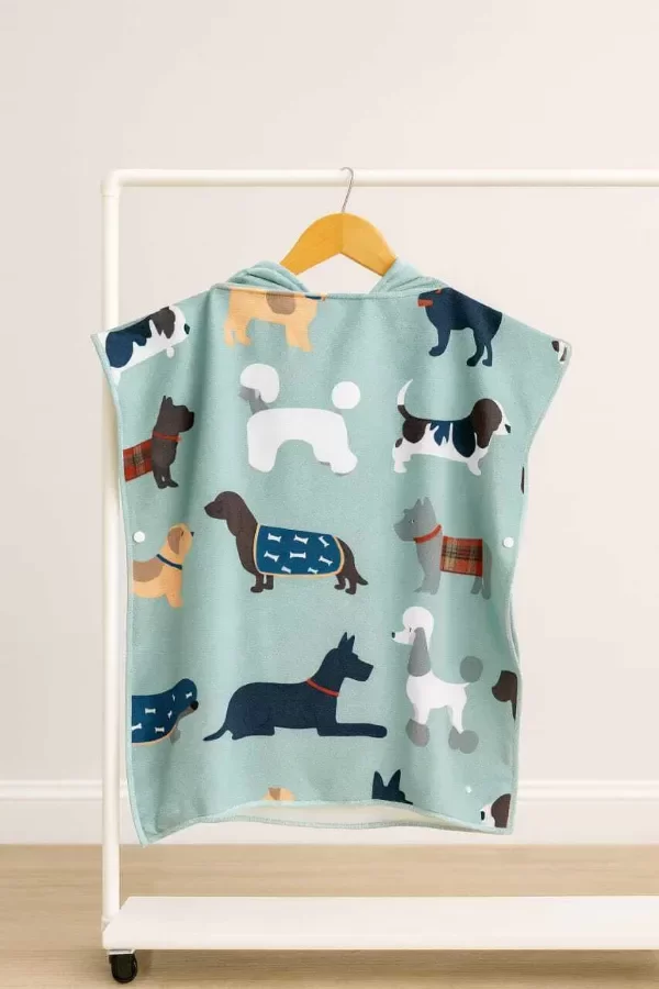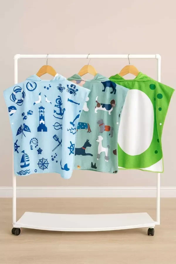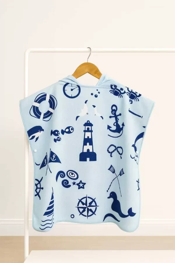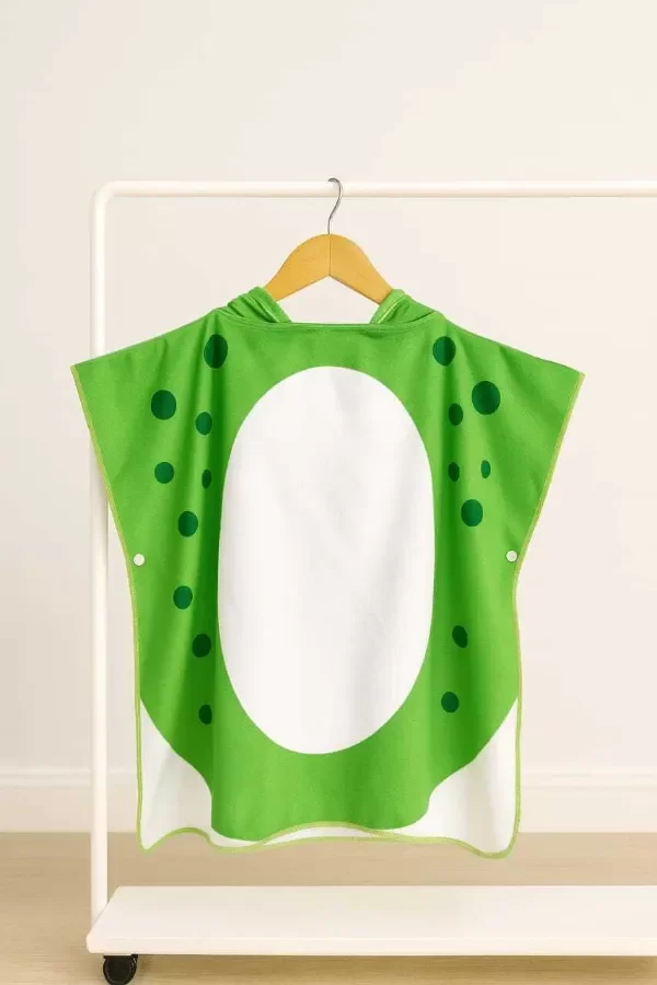 Ponchito de toalla con capucha y brochecitos plásticos a los costados. 100% microfibra de secado rápido. Edad aproximada: 2 a 7 años