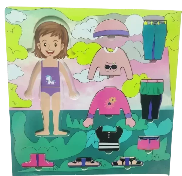 Juego de encastre de madera con base y 10 prendas para combinar.