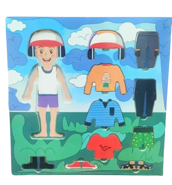 Juego de encastre de madera con base y 10 prendas para combinar.