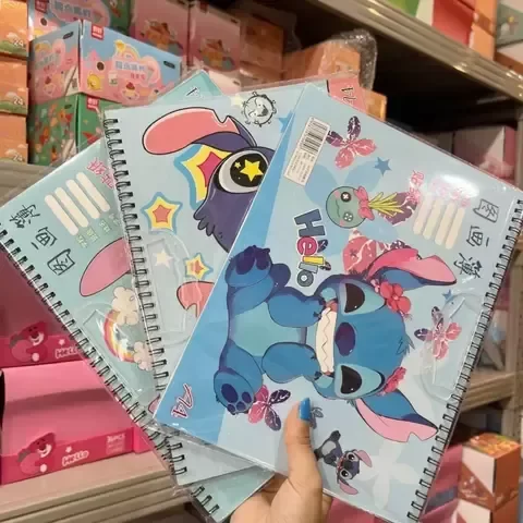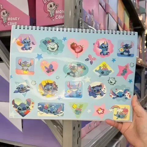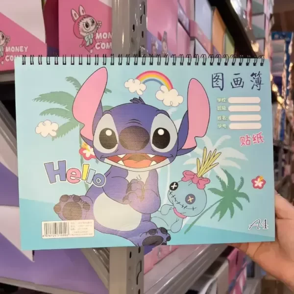 Cuaderno de dibujo tamaño A4 con tapa ilustrada de Stitch y espiral metálico. Incluye hojas blancas lisas para dibujar o escribir, además de una hoja de stickers decorativos con diseños coloridos de Stitch.