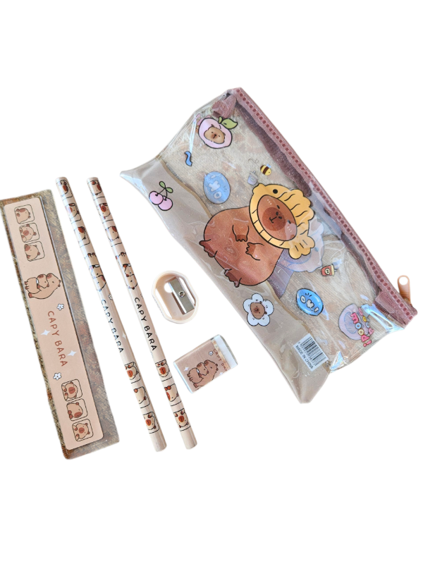 Cartuchera transparente con cierre. Incluye goma, sacapuntas, regla de 15 cm y 2 lápices negros.