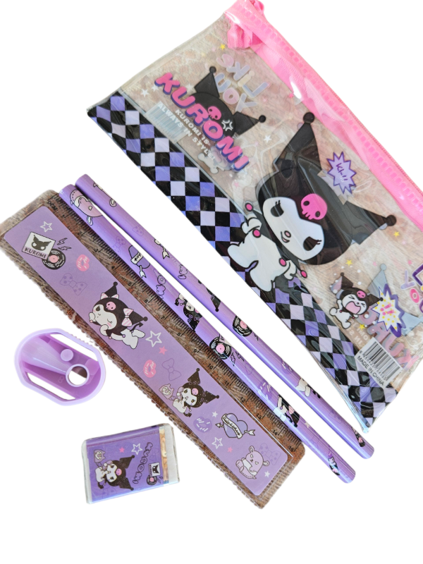 Cartuchera transparente con cierre. Incluye goma, sacapuntas, regla de 15 cm y 2 lápices negros.