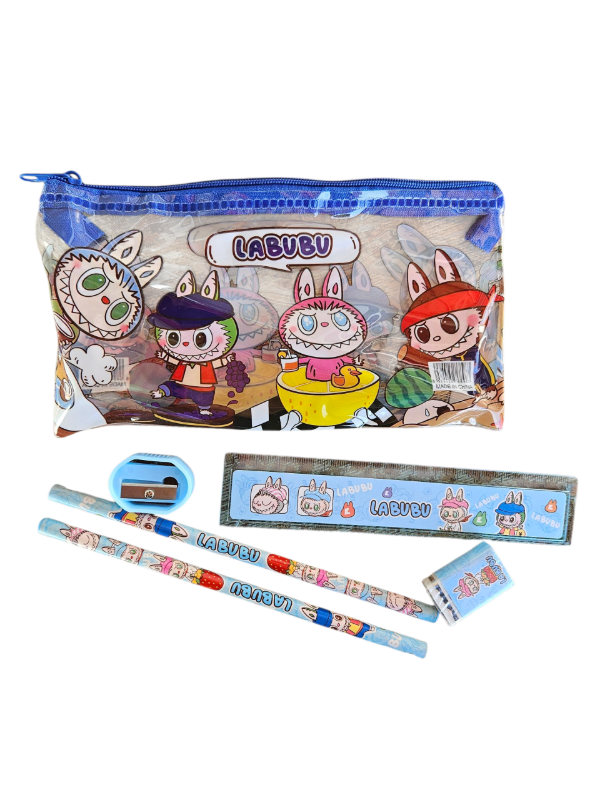 Cartuchera transparente con cierre. Incluye goma, sacapuntas, regla de 15 cm y 2 lápices negros.