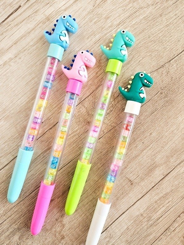 Lapicera azul trazo fino con dijes de letras para armar pulseras.