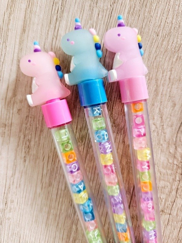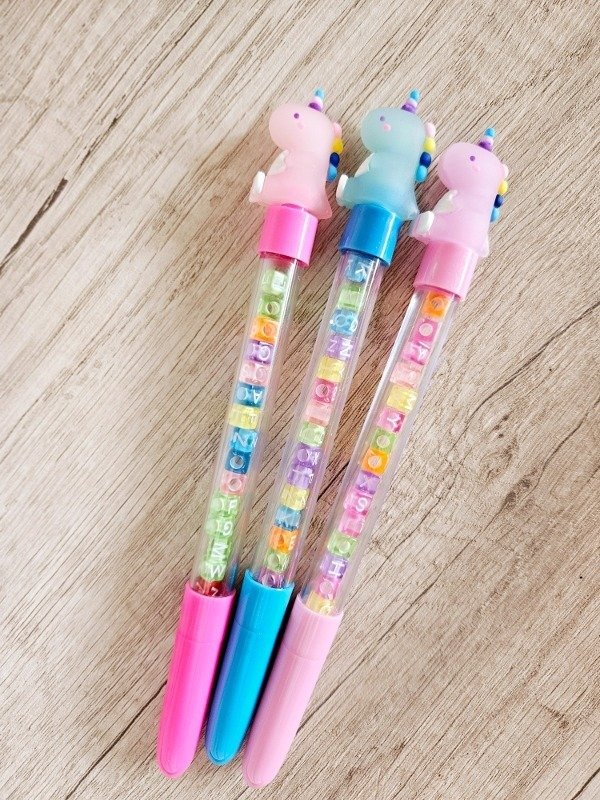 Lapicera azul trazo fino con dijes de letras para armar pulseras.