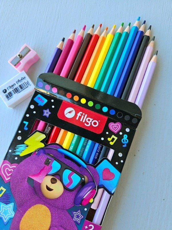 12 lápices hexagonales de colores + 2 lápices hexagonales HB + 1 sacapuntas + 1 goma de borrar.