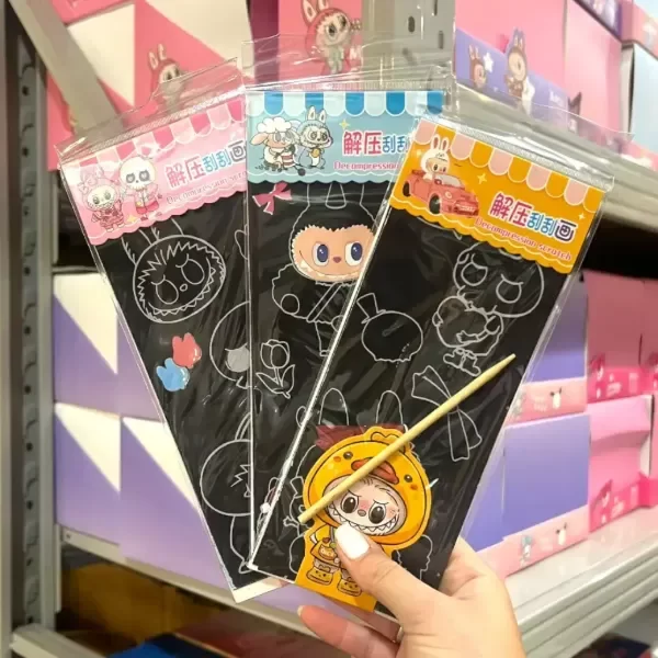 Incluye 4 hojas negras con ilustraciones, que al rasparlas aparecen colores. Incluye "lápiz" de madera.