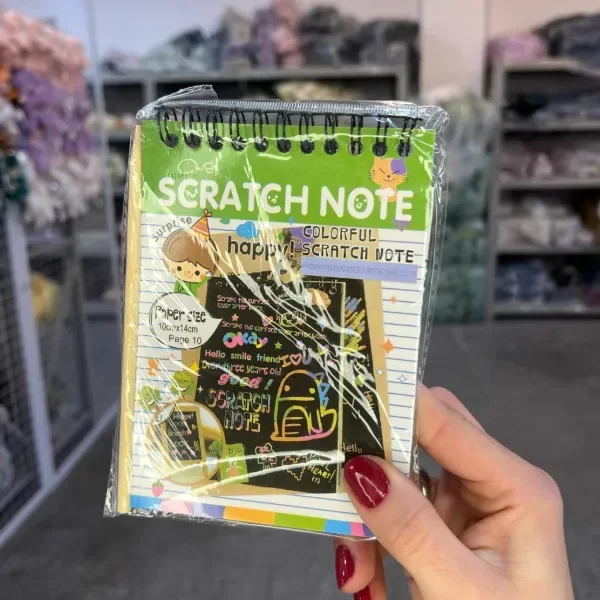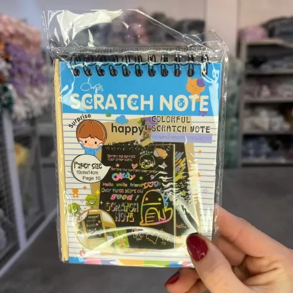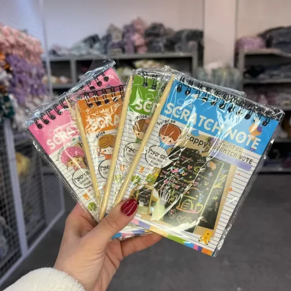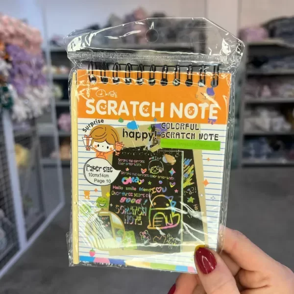 Anotador con 10 hojas negras, que al rasparlas aparecen colores. Incluye "lápiz" de madera.