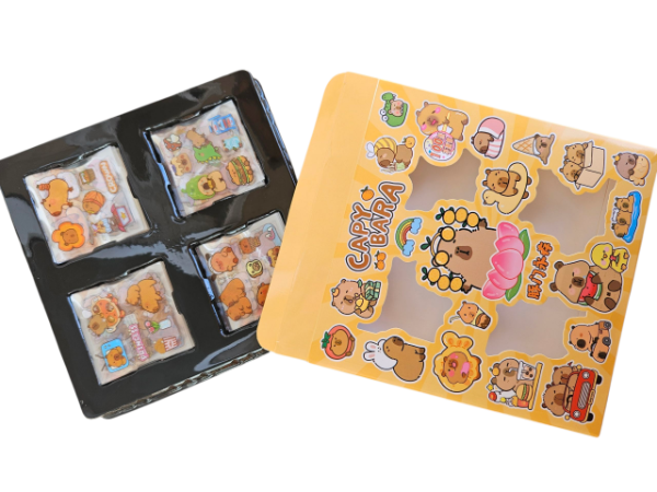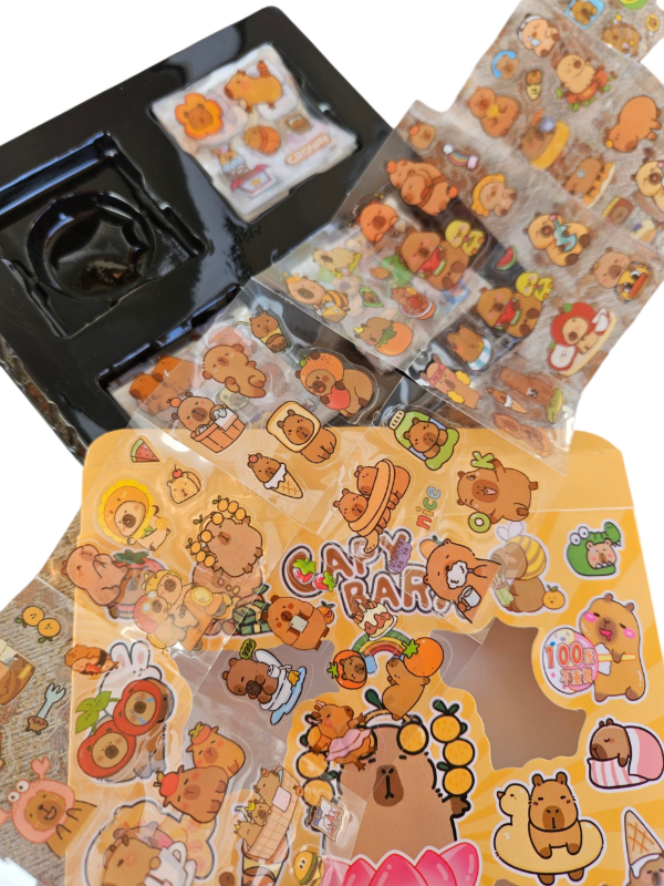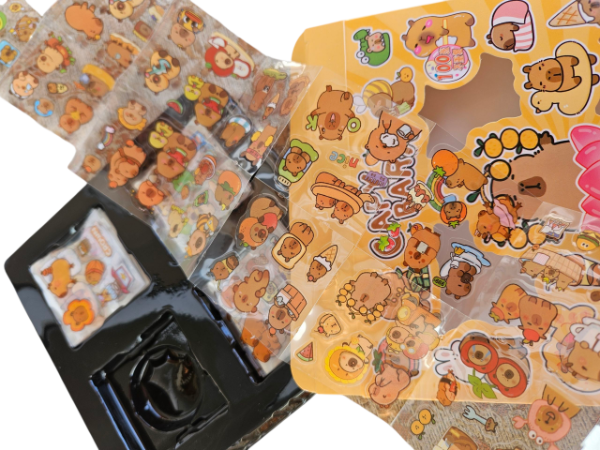 Caja con 100 planchas de stickers de 5,5 x 5,5 cm cada una.