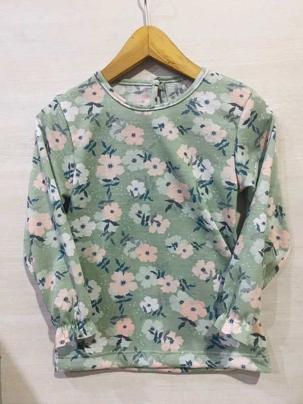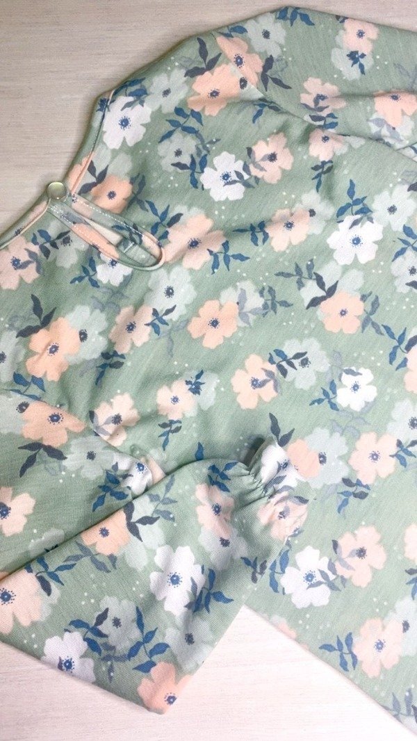 Remera de jersey de algodón, con botón en el cuello y elástico en mangas. Super delicada!