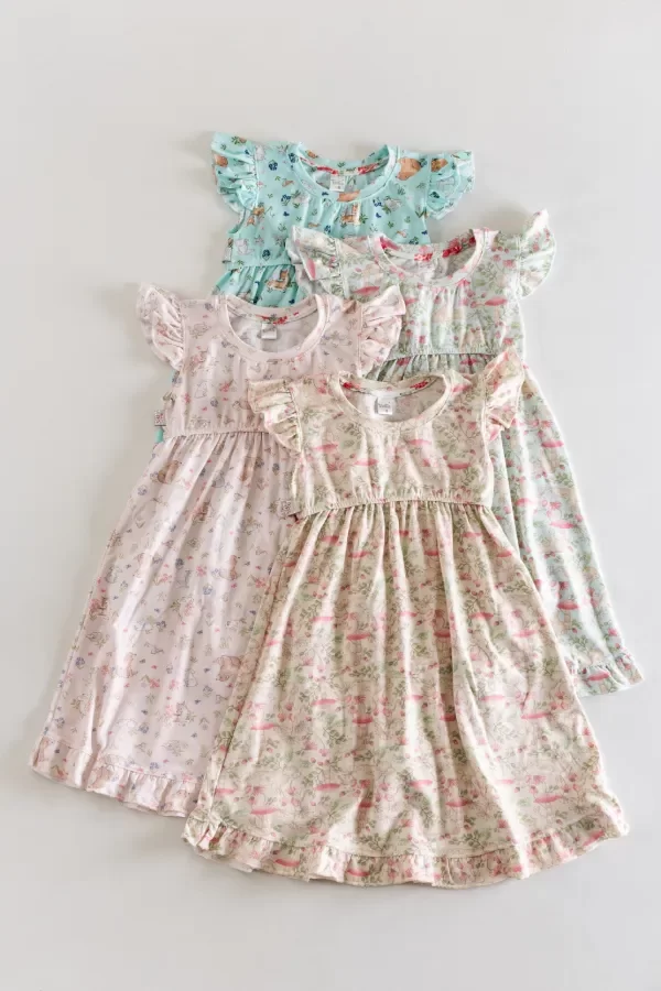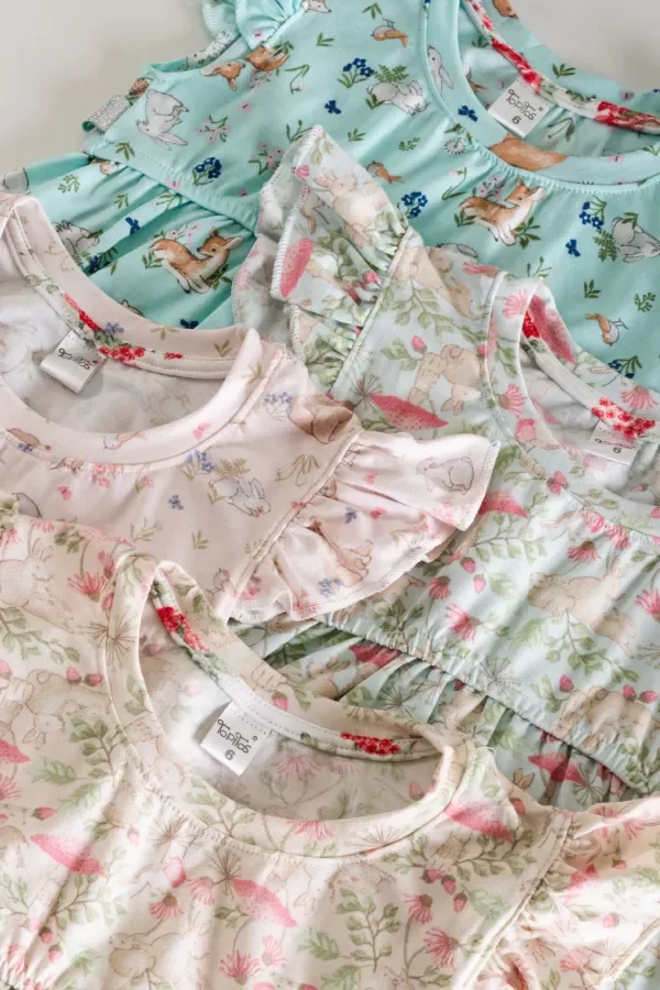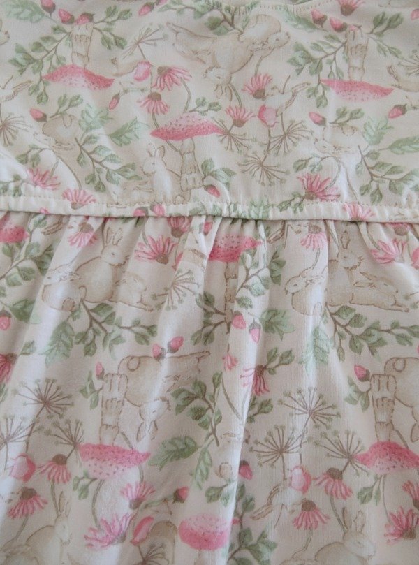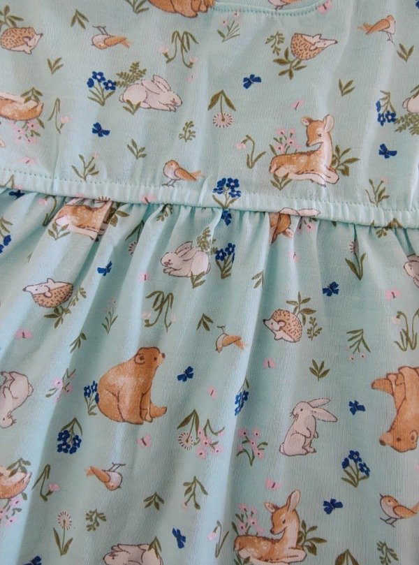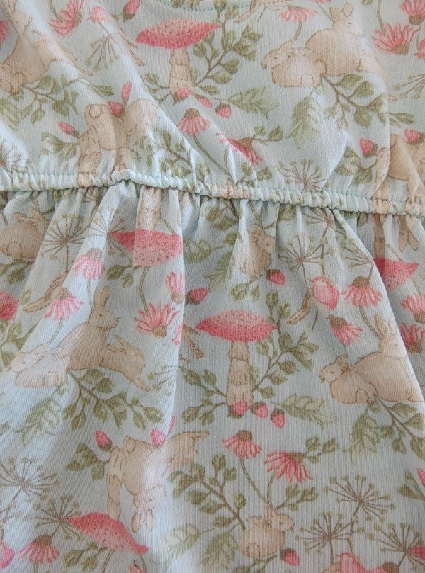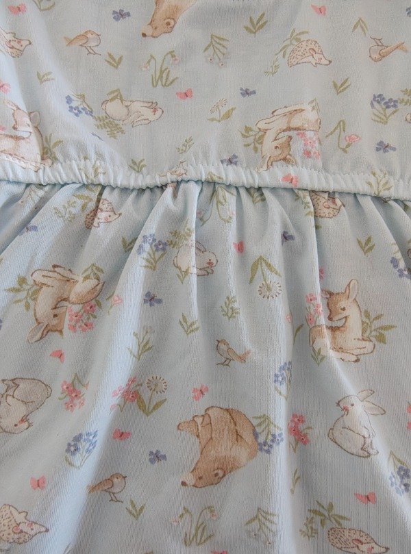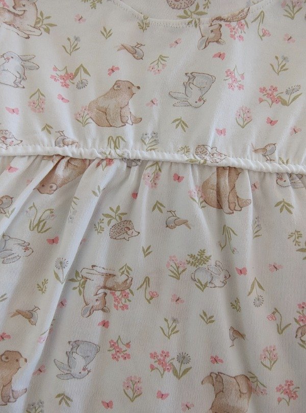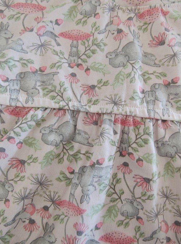 Vestido de algodón y lycra, con volados en los hombros y abajo y elástico en la cintura.